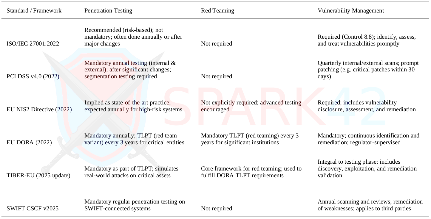 This TL:DR table summarizes how major cybersecurity standards and regulations—ISO 27001, PCI DSS, NIS2, DORA, TIBER-EU, and SWIFT CSCF—approach penetration testing, red teaming, and vulnerability management.